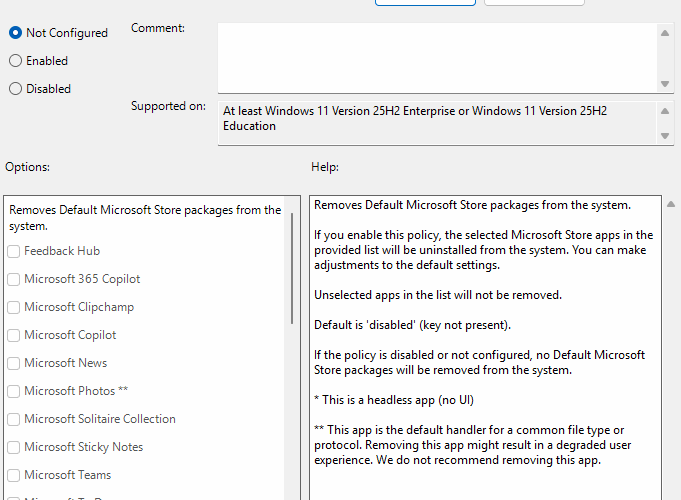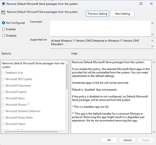 With Windows 11 25H2, we can also use GPO to administrators can use Group Policy Objects (GPOs) to uninstall specific Microsoft Store apps.