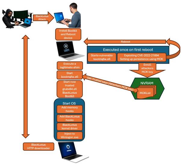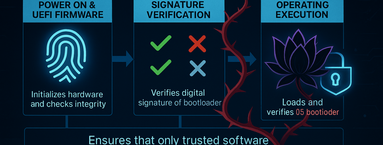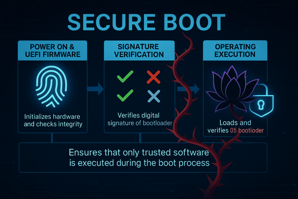 A well-known example of Secure Boot being bypassed is BlackLotus. Researchers reported it as the first bootkit seen in the wild that could get past UEFI Secure Boot. BlackLotus abused a weakness in older bootloader components (tracked as CVE‑2022‑21894) and relied on the fact that vulnerable signed binaries were not yet effectively blocked everywhere via revocation.