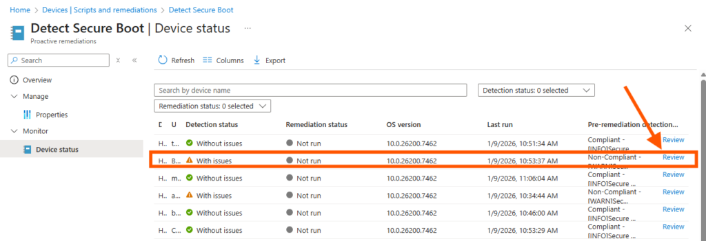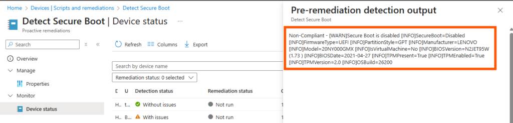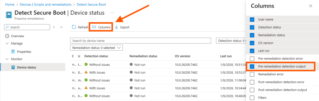 Now you can see all devices that has run and reported the status. - Click on Columns and add Pre-remediation detection output