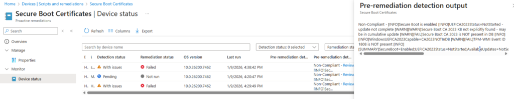 Now that we have all the facts and statistics on where secure boot is enabled we need to start focus on the new secure boot certificates. It is not possible to update the certificates using Intune remediation. But, we can prepare for it and let the device try to update by them selves.