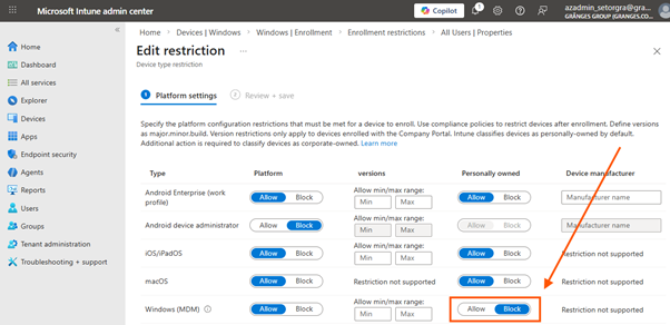 Microsoft Intune’s device platform restrictions are designed to block or allow device enrollment based on platform, OS version, manufacturer, and ownership type (personal vs. corporate). For Windows, the restriction to block personally owned devices is intended to prevent BYOD scenarios from resulting in full device management.