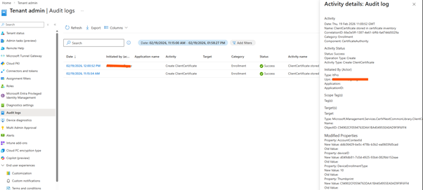 5. ClientCertificate Creation with DeviceEnrollmentType 14: The audit log shows the creation of a client certificate with DeviceEnrollmentType 14, confirming that the enrollment was user-driven and initiated via the app flow.